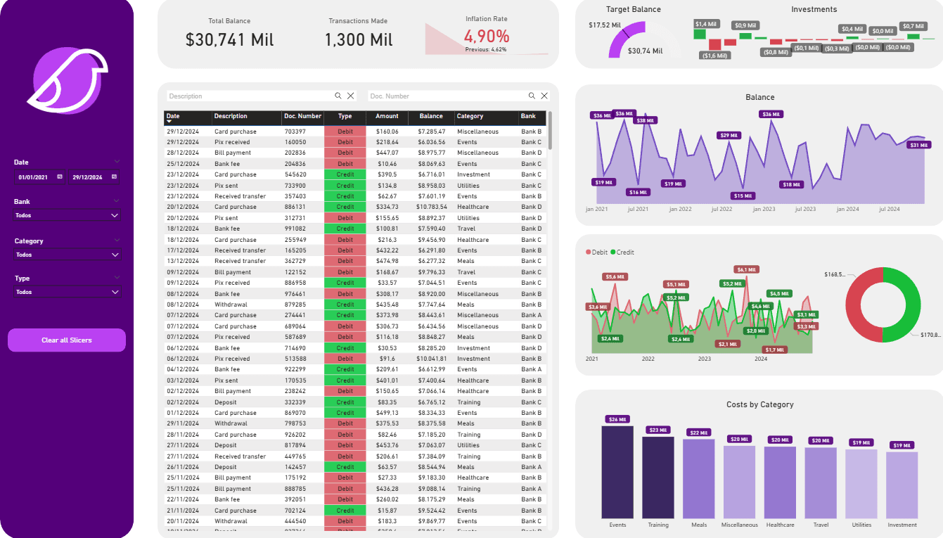 This project is a complete dashboard for personal finance control and analysis, developed in Microsoft Power BI. The solution centralizes transactions from multiple bank accounts into a single interface, providing the user with a holistic view of their financial health, with analyses of cash flow, net worth evolution, expenses by category, and goal tracking.