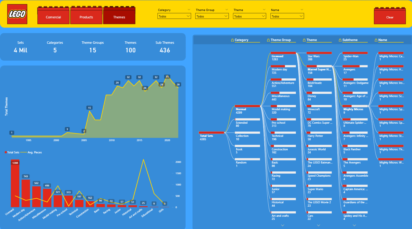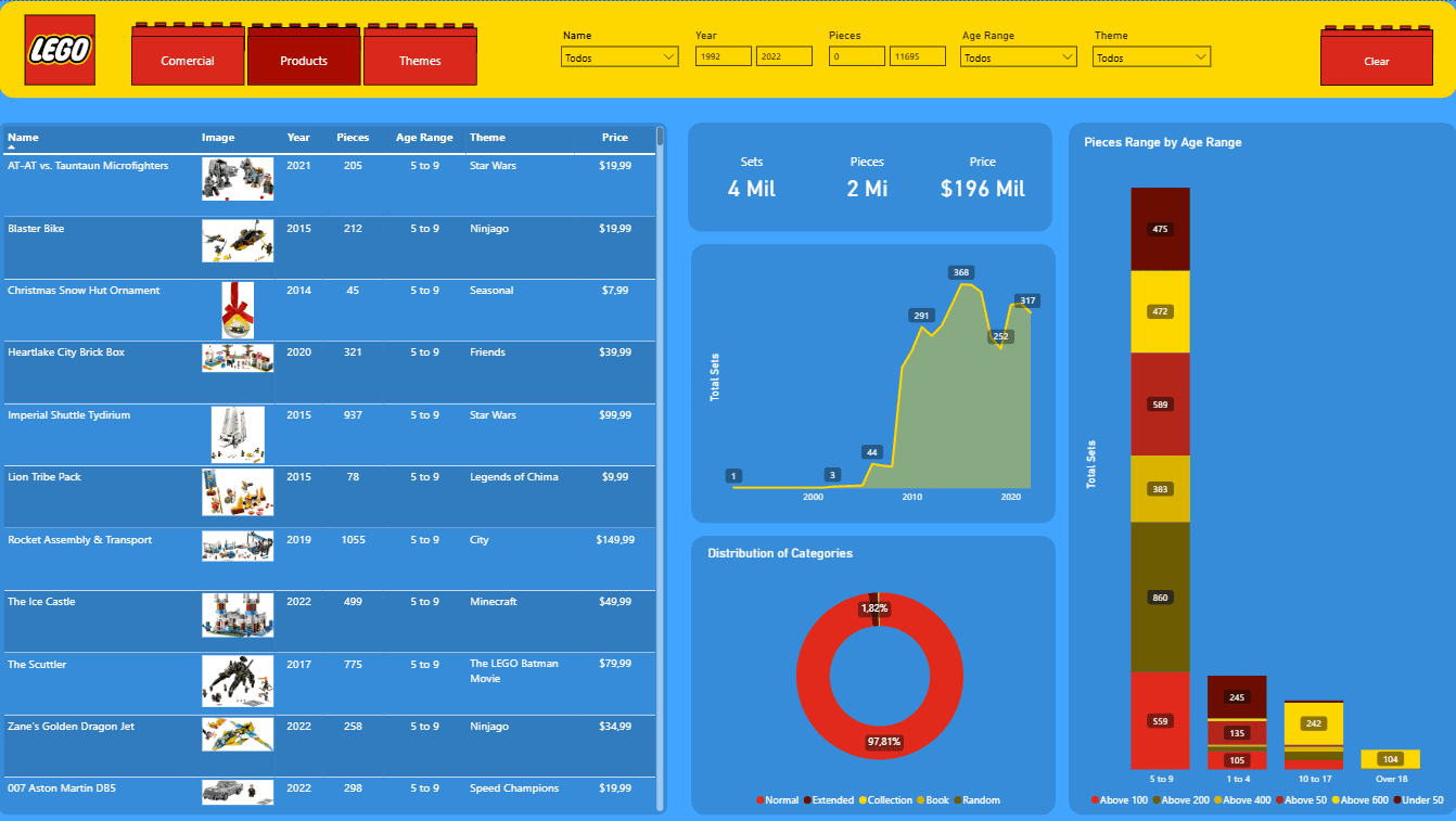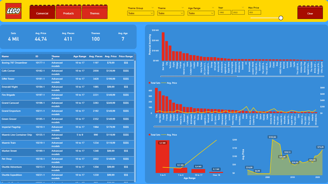 This project consists of a comprehensive and interactive dashboard, developed in Microsoft Power BI, to analyze a vast dataset of thousands of LEGO sets. The main objective is to extract strategic insights about the product portfolio, market trends, theme performance, and pricing behavior, offering a powerful tool for decision-making.
